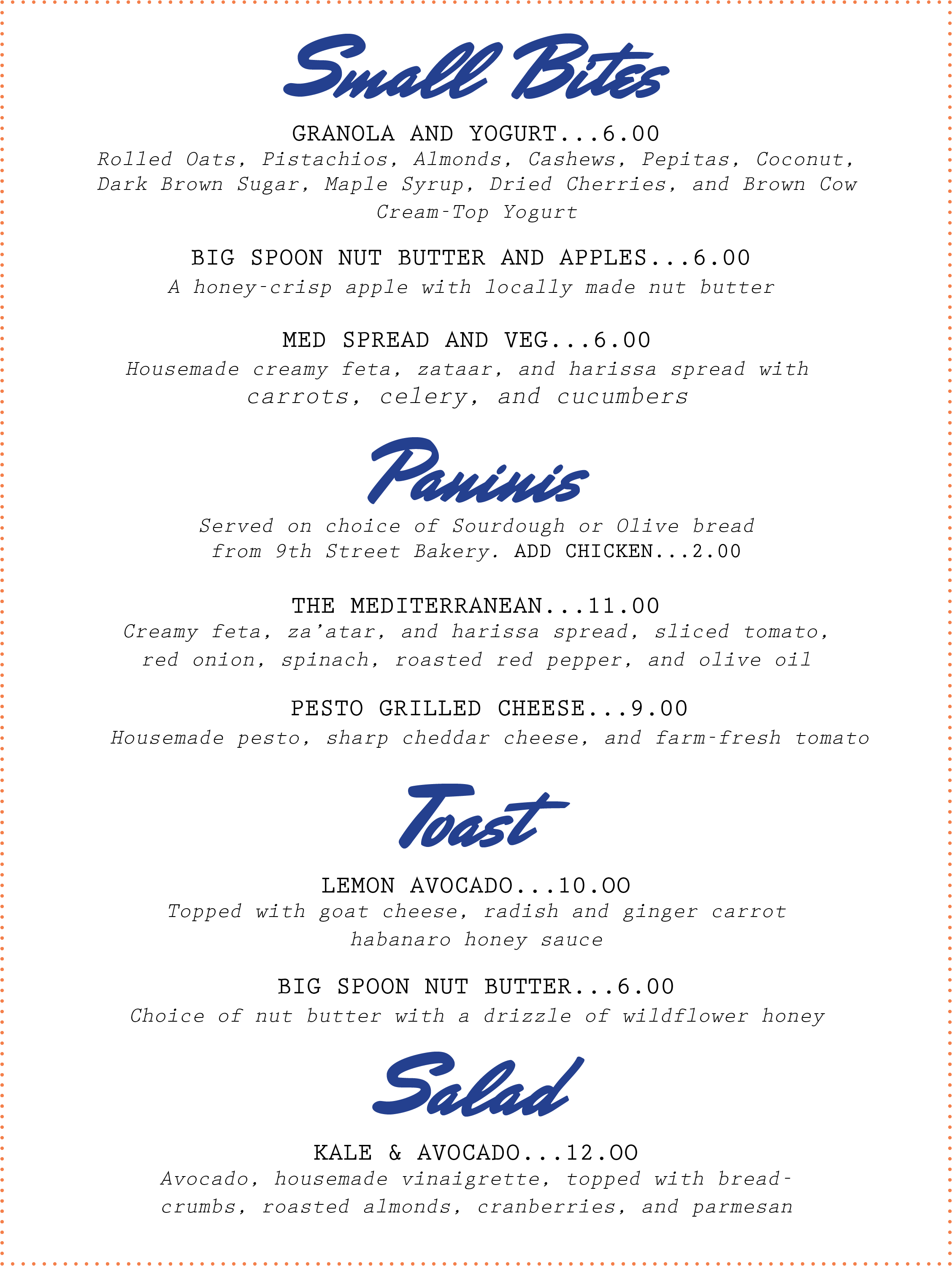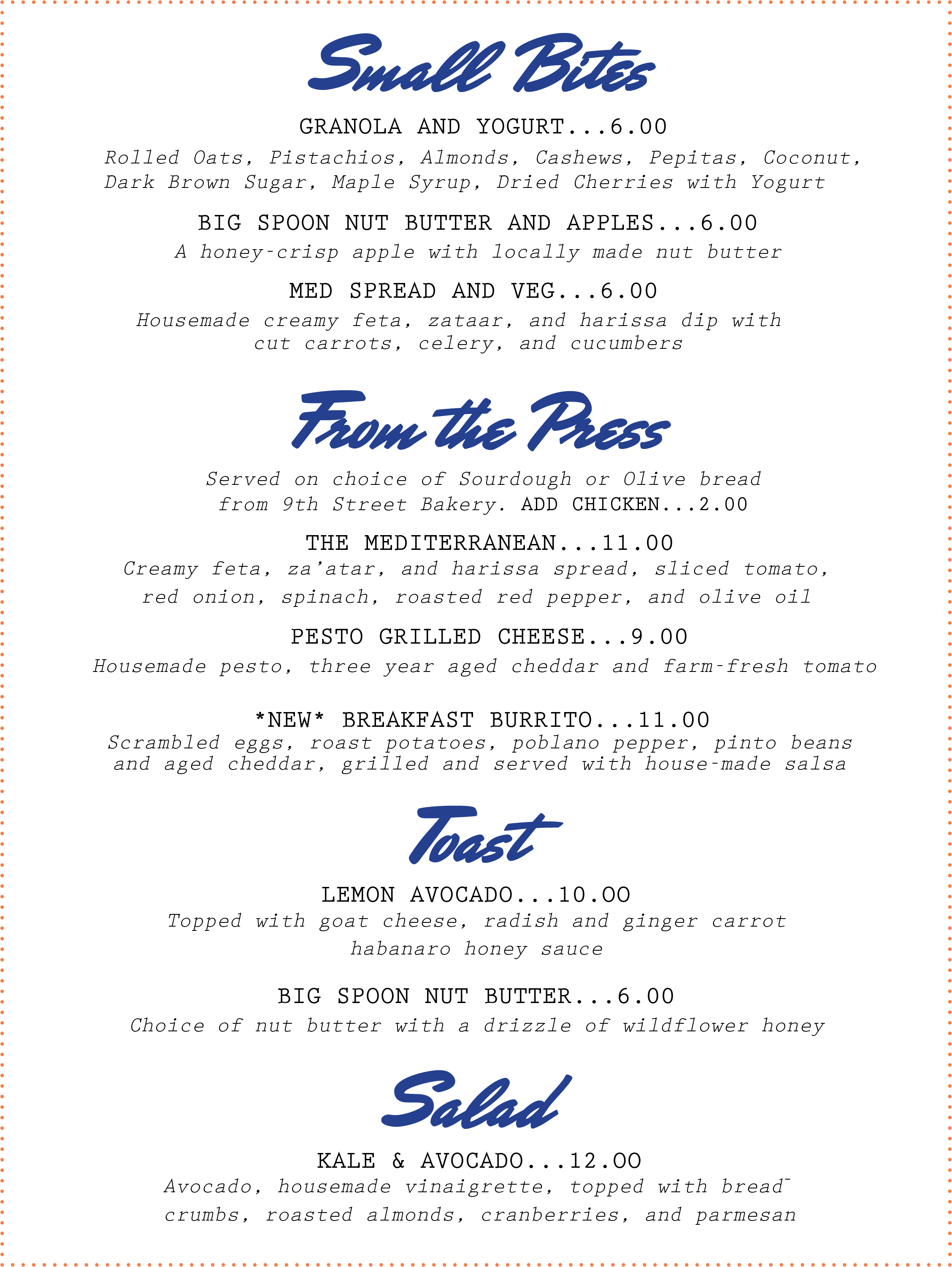 We craft delicious, healthful food prioritizing local, organic & responsibly-sourced ingredients whenever possible. In addition to our full coffee menu, we offer fresh juices, smoothies, toasts, paninis and salad to fuel your everyday adventure.